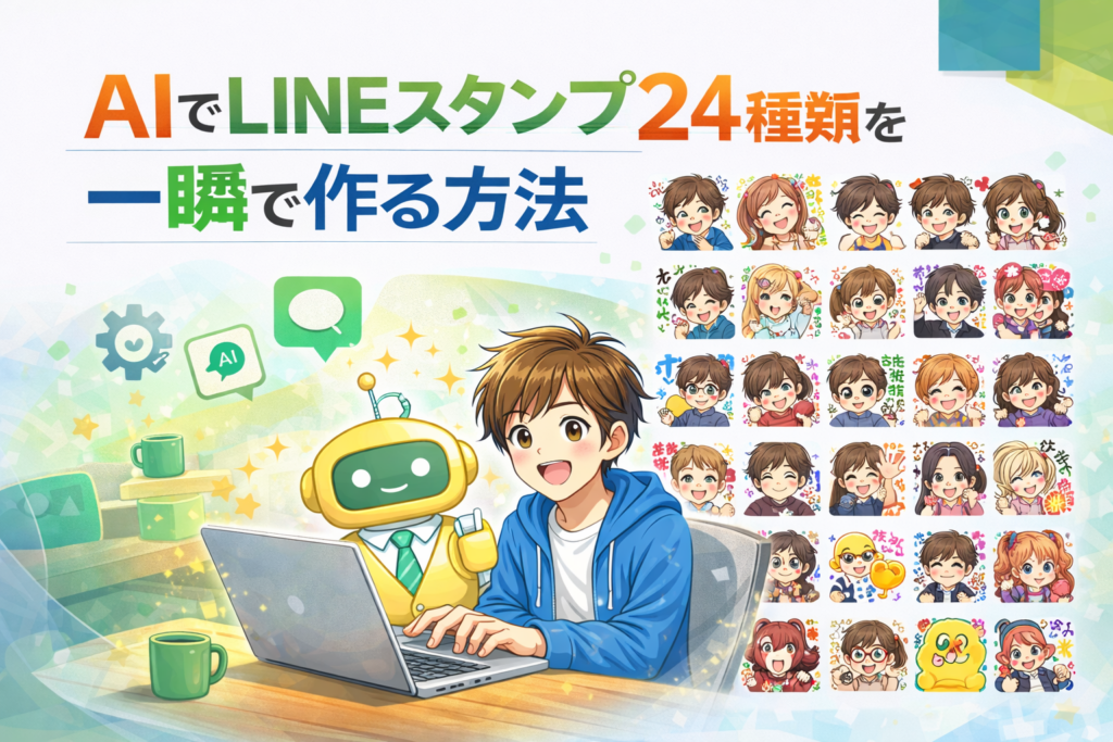 AIを使って同じキャラクターのLINEスタンプ用イラストを24種類まとめて作る方法を紹介します。