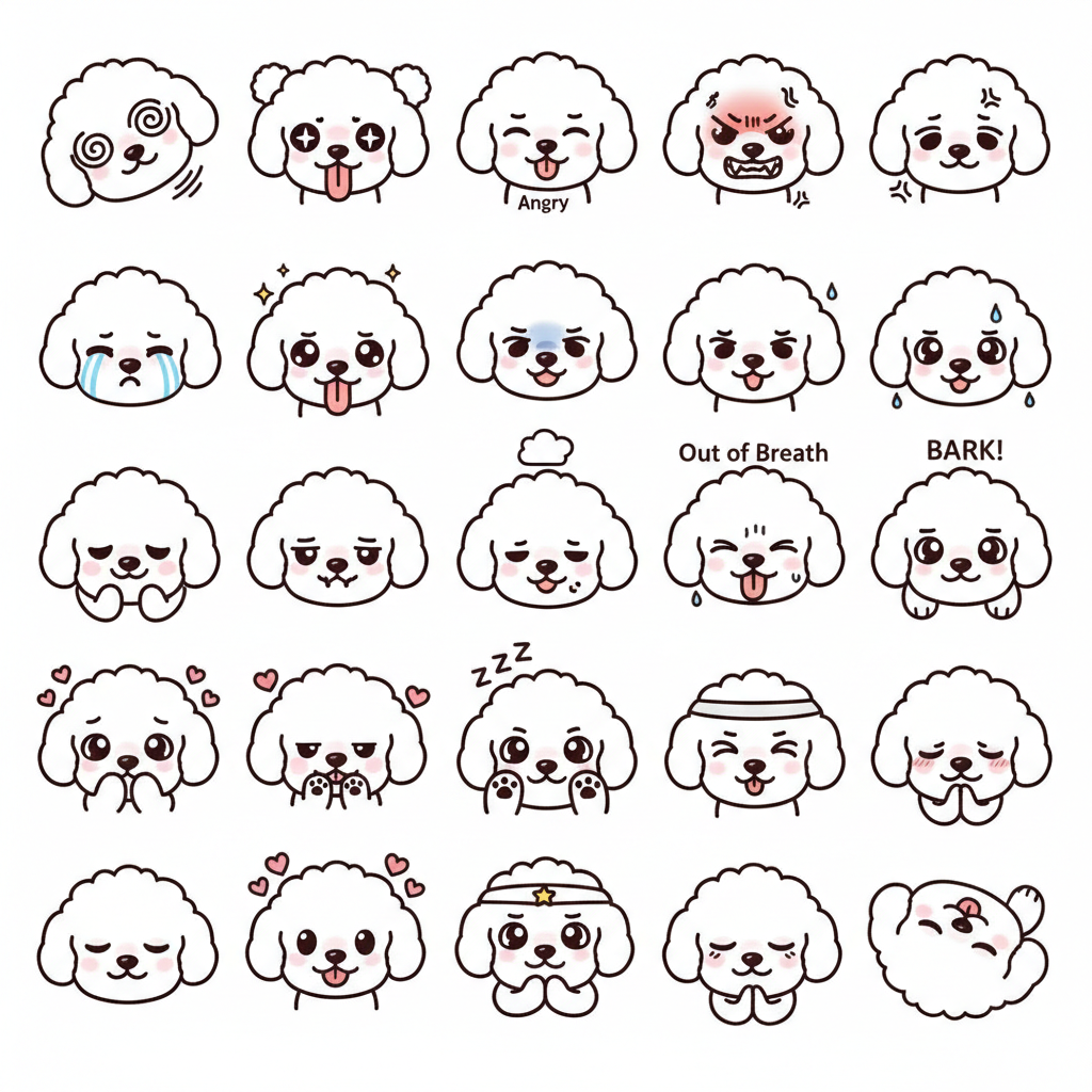 Toy poodle, head, cute, white background, 24 different expressions, faces [dizzy, happy, angry, squealing, sad, cute, expectant, out of breath, barking, disappointed, shy, sleepy, eating, confused, loving, etc], However, these words are not included, and only illustrations are output., illustration style, Digital art –ar 1:1